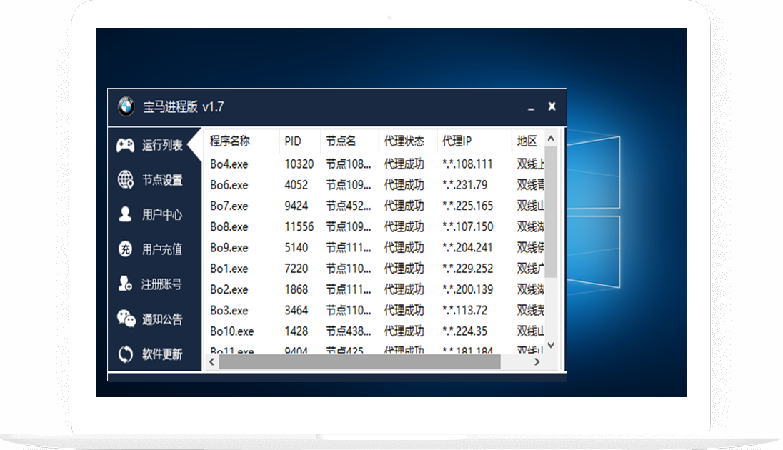 宝马是国内知名代理IP软件,解决网络IP被封,异地登陆,高质量代理IP地址,IP修改器,IP转换器,动态IP代理,自动换IP软件。